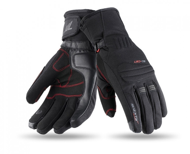SD-C27: Hosszított szárú városi motorozáshoz készült poliamid, szintetikus bőr és szarvasmarhabőr keverékéből készült női kesztyű. 100%-ig vízálló és szélálló WinterTex membrán lélegző, Polartherm béléssel, Thinsulate bevonattal, mely lehetővé teszi az alacsony hőmérsékleten való motorozást. Megerősített bőr tenyér résszel, gumírozott passzé csuklórésszel és állítható tépőzárral a csuklónál. Ujjak hegyén érintőképernyős telefon, navigációs készülékekkel való kompatibilitást segítő kiképzés. Speciális varró- és fröccsöntő rendszerrel készítik a kesztyűt, ami így tökéletesen alkalmazkodik és illeszkedik a kezed vonalához a maximális ergonómia elérése érdekében. XS-XL méretig, fekete/piros összeállításban rendelhető. Rendelkezik CE minősítéssel és motoros ruházati homologizációval. Őszi - téli viseletre egyaránt használható.